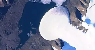 Romer Lake is famous for its impressive Elephant Foot Glacier, a wide piedmont glacier with a strikingly-shaped 5.4 kilometres (3 mi) wide terminal lobe flowing into the lake from the SE in its central part.[1][4]
