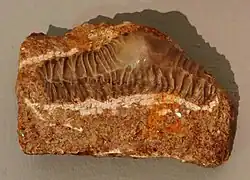 The Stark and Wea shales preserve a variety of other fishes in addition to Romerodus, including some of the most complete cartilaginous fish specimens known from the Paleozoic.[3][25] These include Cobelodus,[8]: 228–232 Heslerodus,[27] Listracanthus,[8]: 243 [26] several species of well-preserved iniopterygian,[25][28] and other eugeneodonts such as Gilliodus,[1] Agassizodus, and indeterminate genera known only from a pectoral fin or isolated tooth whorls.[8]: 237 Conodonts and paleoniscoid fishes are also known,[23][8]: 285–287 with the conodont variety providing further evidence of a deep, stratified water column with multiple faunal communities at varying levels.[24] The known invertebrate fossils of the Stark and Wea shales include jellyfish, brachiopods, crinoids, bryozoans,[3] and multiple species of tyrannophontid.[3][26] It has been proposed that the tyrannophontid crustaceans, which are found only in isolated regions, may have been part of a poorly known benthic fauna which was adapted to oxygen-poor deep waters, or alternatively originated from die-offs in a shallower ecosystem nearby.[26] Multiple species of small, ink-producing coleoids are known from the Stark Shale, as well as several kinds of ammonoid.[5]