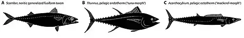 The appearance of Romerodus was typical of a caseodontid.[6][11] The gill arches may have supported either separated, shark-like gill slits or a single chimaera-like operculum (gill cover).[11][12]: 143–144, 167 According to Zangerl's 1981 description, the profile was fusiform, with a forked, homocercal caudal fin and greatly enlarged keels at the base of the tail (termed the caudal peduncle).[1] No specimens show any indication of pelvic fins, a pelvic girdle, or claspers,[1][13] suggesting that these structures were either greatly reduced or absent in life.[6][12]: 167–169 Neither a second dorsal fin nor fin spine has been identified, as in other eugeneodonts.[1][14]