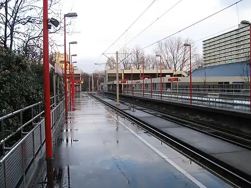 This station was opened on 28 May 1983 when the East-West Line (also formerly the Caland line) was extended from its previous terminus Capelsebrug. It is on a section of line that uses overhead wires to provide traction power.