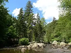 Under the direction of the chief mining engineer (Oberbergmeister), Ahrend, a new, "comfortable road" was driven through the Oker valley to the "birch valleys" (Birkentäler). This was built from 1856 to 1861 with great difficulty, requiring the blasting of large quantities of rock down to the river banks and costing a total of 28,945 thalers. In 1865, under the direction of the chief smelting engineer, timber was rafted for the last time on the river and the weir on the Oker below the church, built in 1542, was removed. After that, several wood sanding works were set up in the lower Oker valley.[3][5]
