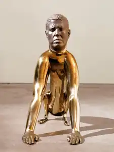 Beginning in 1998, Pondick began to make sculptures that merged parts of animals and flora with those of her own body, primarily casting them in bronze or stainless steel. Pondick merged traditional hand modeling with computer technology in order to create these hybrid sculptures, which incorporate depictions of her own head and hands.[16] For example, in her first work in the series, Dog (1998-2001), she combined a human head and hands with the body of a dog, creating a sphinx-like figure.[17][18] Other human-animal hybrids include Cat, Otter, Muskrat. Monkeys, and Ram's Head.[16][19][20] As Pondick stated, "I use the animal form because it is recognizable and holds its scale no matter where you put it."[5]