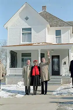 The Ronald Reagan Boyhood Home was constructed in Dixon, Illinois, in 1891; its design is fairly typical of American houses during the time period.[2] The house's original owners were William C. and Susan Thompson; it was eventually sold, in 1917.[2] The home's most significant period was between 1920 and 1923 and between 1975 and 1977 when it changed hands twice.[2] In August 1980 a group of local residents, led by Lynn Knights of Dixon, Illinois, purchased the home. The group was then known as the Reagan Home Preservation and Restoration Committee.[2]