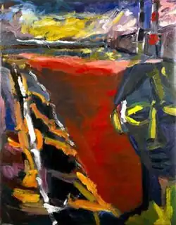 Walsh first exhibited paintings at the age of seventeen, drawing attention both from the Irish Times and the Irish Independent.[4] His early work, primarily landscapes with people, possessed the lyrical, semi-abstract, slightly Surrealist aesthetic that could then be seen in the contemporary work of older Irish artists such as Patrick Collins, Louis le Brocquy and Walsh's own father, the artist Owen Walsh. Subsequent to graduating from NCAD, the setting and the aesthetic of the paintings begins to change. The semi-abstract, pastoral landscapes are replaced with more figurative depictions of urban settings; the early romantic lyricism gives way to a harder-edged Expressionist style articulated through thick, heavily textured paintwork and the utilization of found objects. At this time, 'his handling of paint is raw, his approach is physical and aggressive,'[5] But Walsh's style was not traditionally Expressionist: 'actually there is very little of the archetypal German Expressionist about Walsh, his use of colour is more comparable to the French.'[6] Towards the end of the eighties, Walsh becomes affiliated critically with the Neo-expressionist and Transavantgarde movements in Europe. The shift from abstraction "towards figuration [7] and greater realism becomes most pronounced in the 1990s, a decade in which Walsh also shifts his focus from the urban to a more natural setting of forests and beaches.