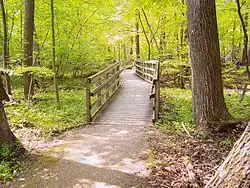 Rondeau Provincial Park is the second oldest provincial park in Ontario, Canada, having been established with an order in council on 8 September 1894.[3] The park is located in Southwestern Ontario, on an 8 km long crescentic sand spit extending into Lake Erie. Rondeau is home to the largest area of Carolinian forest in Canada,[4] a long sand beach, a large marsh, approximately half of Rondeau Bay, campgrounds and a cottage community. The name of the park comes from the French words "ronde eau" or "round water" which describes the shape of the harbour sheltered by the peninsula.[5]