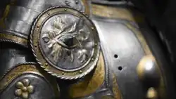 In late-medieval and Renaissance armour the (axillae) were protected by besagews. These often took the form of a plain, slightly convex rondel that hangs from either the pauldron or the top edge of the gorget, covering the otherwise exposed gap at the arm’s forward pivot. The plate is normally secured with a very short leather strap and buckle, with laces, or on some breastplates by a turning pin.[5][6]