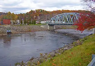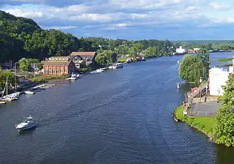 North of the Shawangunks, where the Wallkill trickles down from Sturgeon Pool, it is wide enough to be referred to as the Rondout River at some points.[5] At Creeklocks, the former northern outlet of the canal, it becomes wide and deep enough to be navigable, and several marinas line the banks of the stream, now more than 100 feet (30 m) wide, at Kingston just above its mouth.[6]