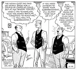- Knock-offs, such as Associated Press' Mister Gilfeather (which, by the way, was handled at various times by both Al Capp and Milton Caniff, before they hit it big with Li'l Abner and Terry and the Pirates, respectively), began to proliferate. In fact, it was a knock-off that took Ahern away from his creation. King Features launched one called Room and Board, starring the very Hoople-like Judge Puffle, in 1936, and hired Ahern himself to write and draw it. This was a reprise of a move King had made nine years earlier, hiring George Swanson (Elza Poppin) to produce a duplicate of his own NEA strip, Salesman Sam, and it had a similar result — success, but not to the extent of the original. When, in 1953, Ahern retired, Room and Board ended. Today, its memory is overshadowed by its own topper, The Squirrel Cage, where the enigmatically familiar phrase, "Nov shmoz ka pop?" was introduced.[6]