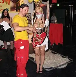 Rope bondage, also referred to as rope play, kinbaku, shibari or fesselspiele, is bondage involving the use of rope to restrict movement, wrap, suspend, or restrain a person, as part of BDSM activities.[1] Japanese bondage is the most publicly visible style of rope bondage. An alternative style, "Western bondage" is about achieving restraint; the Japanese style is more concerned with the artistry of the process.[2] String bondage is the wrapping of rows of string around a body area for arousal. String bondage is also known as "constrictions".[3][4]