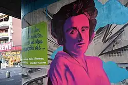 The road's name refers to activist Rosa Luxemburg. She is portrayed at a pier of the elevated road section in Ginnheim – in pink since in German language Rosa is also a word for that colour.