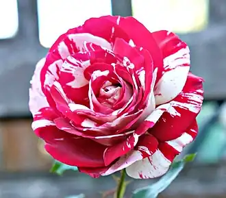 'Rock & Roll' is a medium shrub of upright bushy growth, 4 to 5 ft (121–152 cm) in height. In summer, it bears clusters of very fragrant, burgundy, red and white striped petals on long stems. Blooms have an average diameter of 5 in (10–15 cm) and have 35 to 40 petals.[3] Flower size is medium to large and best in the spring and fall. 'Rock & Roll' is disease resistant with dark, glossy green foliage.[4][5]