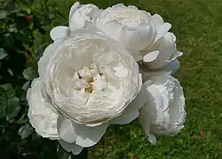 Rosa 'William and Catherine' is a white shrub rose introduced into the United Kingdom in 2011.[1] It is a cultivar developed by the British rose breeder, David C. H. Austin. 'William and Catherine' was named in celebration of the wedding of Prince William and Catherine Middleton.[1] The rose is described as having "white, shallowly cupped, full petalled" blooms and a moderate to strong fragrance of pure myrrh.[2] The flowers develop from creamy orange buds and reach an average diameter of 8 centimetres (3.1 in), while the shrub reaches a height of 125 centimetres (49 in) at a width of 90 centimetres (35 in).[3][4]