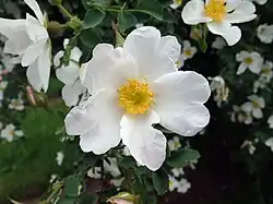 Rosa fedtschenkoana is a species in the plant genus Rosa in the family Rosaceae. Some authorities consider it a synonym of Rosa webbiana.[1] It is native to the foothills of the Ala Tau, Tian Shan and Pamir-Alai mountain ranges in central Asia and northwest China.[2] It is named after Olga Fédchenko, a Russian botanist. It is deciduous, forming a bushy and suckering shrub up to 2.5 metres high and as much across. The branches are covered in many prickles, many of which are fine and straight, but some are thicker and slightly hooked. The pinnate leaves are pale greyish green in colour and have usually between 7 and 9 leaflets. The flowers are white, up to 5 cm across, and are borne singly or in small clusters at the tips of the branches throughout the summer months.[3] The flowers' scent has been described as being "like 'Hovis' [brown] bread with a little blackberry jam".[4] The flowers are followed by small, pear-shaped, bristly orange-red fruits.[5]