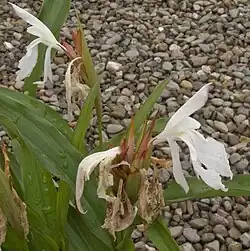 Like all members of the genus Roscoea, it dies back each year to a short vertical rhizome, to which are attached the tuberous roots. When growth begins again, "pseudostems" are produced: structures which resemble stems but are actually formed from the tightly wrapped bases (sheaths) of its leaves.[2] R. × beesiana is usually 48–60 cm tall, with seven to nine leaves, of which at most the lowest one consists only of a sheath. Each leaf has a small ligule, extending to about 1–2 mm. The blade of the leaf (the part free from the pseudostem) is usually 8–29 cm long (occasionally as little as 4 cm long) by 2.1–4.5 cm wide. There are small "ears" at the junction of the blade and sheath (i.e. the leaf is somewhat auriculate). The leaf sheath has reddish markings.[3]