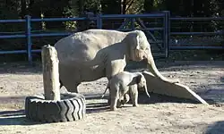 Rose-Tu was mated again with Tusko and, in 2012, gave birth to a 300 lb (140 kg) female calf named Lily.[25][26][9] Her name was chosen in an online poll.[26] Shortly after Lily's birth, The Seattle Times reported that Lily, like her father, was owned, not by the Oregon Zoo, but by private elephant ranch Have Trunk Will Travel and that she could be removed from the zoo when she turned three. This was as a result of the agreement the Oregon Zoo made when they were loaned Tusko, where it was stipulated that half of Tusko's offspring would go to the zoo, and the other half to the ranch. Animal Defenders International and Bob Barker called for the zoo to keep Lily.[27] In 2013, the Oregon Zoo purchased both Lily and Tusko for $400,000 from Have Trunk Will Travel.[28][29] Photographs of Rose-Tu and Lily were featured prominently in Elephant House, a 2015 photo book about the lives of elephants at the Oregon Zoo.[30] On November 28, 2018, Lily was diagnosed with elephant endotheliotropic herpesvirus. She started showing symptoms the next day, and died on late on November 29, 2018, one day before turning six.[31][32][33]