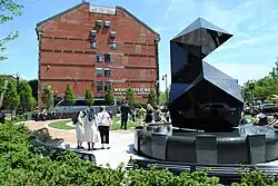 The Armenian Heritage Park is dedicated to the victims of the Armenian genocide and acknowledges the history of Boston as a port of entry for immigrants worldwide, and celebrates those who have migrated to Massachusetts shores and contributed to American life and culture. The Park consists of two key features surrounded by seating, brick paving and landscaping. The Abstract Sculpture, a split dodecahedron, is mounted on a Reflecting Pool, represents the immigrant experience. The Labyrinth,[34] a circular winding path paved in granite and set in lawn, celebrates life's journey. The Park and its endowed programs are a key initiative of the Armenian Heritage Foundation.[35] The park opened in May 2012[36] The park is maintained by the Rose Kennedy Greenway Conservancy under contract with the Armenian Heritage Fountain.