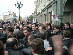 Two events in 2001 caused an outcry of public opinion against the government. In July, a popular anchor for the Rustavi-2 network, Giorgi Sanaia, was murdered. The consensus among Georgian journalists and the public was that he was killed because of his anti-government work on the Chechen conflict and corruption investigations.[11] In October, agents from the National Security Ministry raided the headquarters of Rustavi-2. The tax-raid was broadcast on television from outside the building. Upwards of seven thousand student-led protestors, many mobilized by the Liberty Institute NGO, amassed outside the headquarters and demanded the resignation of the Shevardnadze government. Shevardnadze responded by sacking his cabinet and his minister of security.[21] Importantly, this event triggered the defection of Mikheil Saakashvili and the abdication of Zurab Zhvania from their positions in the Citizens' Union of Georgia, eventually leading to the formation of the National Movement and United Democrats opposition parties.[22]