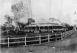 In January 1885 Rose Ball acquired title to a 20-acre (8.1 ha) site about 3 miles (4.8 km) out of town, southwest along the Charters Towers road, at a time when the western and southwestern suburbs of Townsville were emerging as fashionable addresses for successful Townsville businesspersons. On this property Rose and Andrew Ball erected Rosebank, a large timber residence picturesquely situated overlooking a small lagoon and creek (now filled in and part of Mindham Park). The front entrance drive from the main road crossed a causeway and two bridges over the creek/lagoon, then became a circular drive lined by bunya pines and mango trees, surrounding a large rose garden in the front yard. The back approach to the house passed through banyan and Moreton Bay fig trees. Rosebank was developed as a self-sufficient semi-rural estate, with a dairy, cowyard, chicken run, vegetable garden, stables and various storage and fodder sheds, and an underground water supply. Rose Ball also developed a very fine flower garden and bush house at Rosebank, which were famous in the Townsville district. Andrew Ball died at Rosebank in September 1894, aged 62, and his widow remained there until her death in February 1925, aged 83. In January 1912 their only daughter, Annie Alice May, married lawyer Robert Johnstone Douglas (son of Queensland Premier, John Douglas), later a Supreme Court Judge.[3] Mr & Mrs Douglas are understood to have resided at Rosebank from 1912, when they employed Townsville builder E Crowder to renovate the building. The renovations included the installation of a number of pressed metal ceilings, removal of a partition wall to form a library, enlargement of the dining room by opening up the sewing room and pantry, and extension of the kitchen. The verandah floorboards also were replaced at this time. In 1919, title to the property was transferred from Mrs Ball to her daughter.[2]