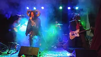 Influenced both musically and visually by the likes of Alice Cooper, Rob Zombie, Gwar, Kiss and Black Sabbath, Rosemary's Billygoat are best known for their theatrical horror-themed stage shows which incorporate many comically absurd props and stunts, including pyrotechnics, fire breathing, electric chairs, mock crucifixion, flaming pentagrams and various costumed monsters and creatures.[1][2] Musically, the band has been described as "aggro and dark yet jovial", showcasing an "oozing brew of doom, stoner metal, dark psychedelic rock and hardcore punk".[1][3]