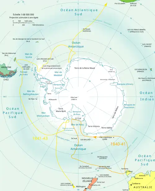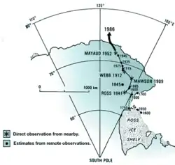 The main purpose of the Ross expedition was to find the position of the South Magnetic Pole, by making observations of the Earth's magnetism in the Southern hemisphere.[22] Ross did not reach the Pole, but did infer its position.[23] The expedition made the first "definitive" charts of magnetic declination, magnetic dip and magnetic intensity, in place of the less accurate charts made by the earlier expeditions of Charles Wilkes and Dumont d'Urville.[19]