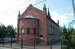 The red brick former Lutheran church was built in 1873 when the village was part of Germany. It is one of the oldest remaining buildings in Rybachy. After the Second World War it was used for wheat storage. Only in 1992 was the church handed to the Russian Orthodox Church to be renovated. It is named after St Sergius of Radonezh and is in use once more as a church, now catering to the Orthodox community. In front of the church is a metal cross cast in 1992 by Eduardas Jonusas, an artist from the neighbouring Lithuanian town of Nida. This cross was erected in memory of the former German citizens of Rossitten.
