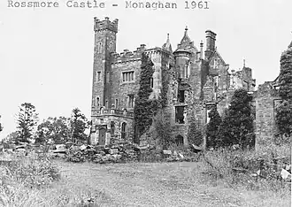 The building was a 19th-century country house built in the style of a castle. It was originally built for The 2nd Baron Rossmore in 1827 in the Gothic style by the Irish architect William Vitruvius Morrison. The building was dominated by a large square tower with turret and crow-stepped battlements, and had a series of gables and oriel windows. It was extended and remodelled in 1858 by the Irish architect William Henry Lynn.[1] There was rivalry between Lord Rossmore and the Shirleys of Lough Fea, and they competed for many years as to who could boast the largest room in County Monaghan; as a result, the drawing room at Rossmore was extended on five occasions, and the house ended up with three towers, and more than 117 windows in at least 53 assorted sizes and shapes.[1] In latter part of the century was known for its social gatherings and gaiety, with Albert Edward, Prince of Wales, being a friend of The 5th Baron Rossmore.[1] The 5th Baron was Lord Lieutenant of Monaghan from 1897 until his death in 1921, when he was succeeded by his son William, who became The 6th Baron Rossmore. After the Second World War, dry rot forced the abandonment of the castle;[1] the family moved to Camla Vale, a more modest Georgian house situated within the estate grounds,[2] and the castle fell into ruins; it was demolished in 1975.[3] Camla Vale was sold in 1962 and has since been demolished.[4]