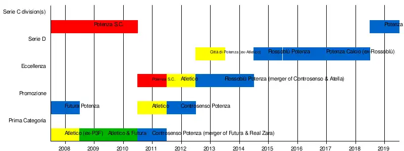 Potenza S.C. was the historical team of the city which under many merger and reformation. The club was expelled from 2009–10 Lega Pro Prima Divisione in the mid-season. The club was re-admitted to 2010–11 Eccellenza Basilicata.[5] In April 2012 the membership of the club in Italian Football Federation was officially cancelled.[6]