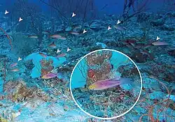 | Cirrhilabrus rubrisquamis (male in circular close-up, females marked by white arrows) and anthias | |