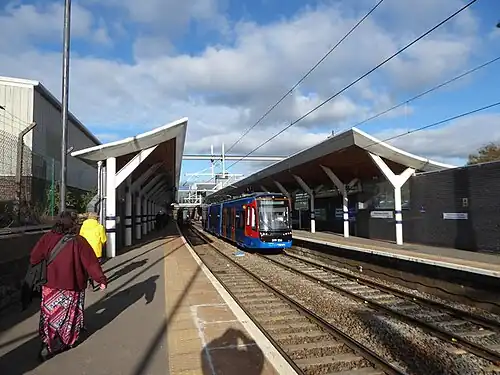 Rotherham Central is also served by the South Yorkshire Supertram Tram-Train, running 2 services per hour between Rotherham Parkgate and Cathedral. The service opened in 2018.[5]