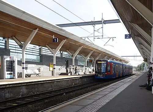 Rotherham Central stop opened on the local Supertram network here on 25 October 2018, and currently operates 2 tram-trains per hour northward to Rotherham Parkgate and southward to Cathedral in Sheffield city centre.[11] The trams are low-floor, meaning they have to call at their own separate low-level platforms. They are numbered 3 & 4, and located to the south of the station. They are connected to the main National Rail platforms via ramps.[12]