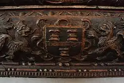 The polychrome engraved mantle of the Rotherwas Room bears a complex arrangement of figural representation and plant motifs, including: guilloche, cartouche motifs, decorative scrolls and foliage, gadroon nulling, and lozenges.[8] The central shield of the overmantel bears 25 family seals, including that of the de la Barre family. The shield sprouts flowing acanthus leaves, which are framed by the four Roman virtues: Justice (who originally held scales), Temperance (who held water and wine), Prudence (who held a mirror, book, or dove in addition to the snake), and Fortitude (who still holds a column).[34] Earlier examples of similar work can be seen in the mantel over the fireplace of Great Fulford, Devonshire.[35] The Bodenham coat of arms would have originally featured a background of deep azure. In heraldic terms, the crest consists of a horizontal stripe (called a fess) between three chess rooks, all rendered in gold. The identities of the remaining twenty-three family crests are not all certain, and some may even have been fabricated in order to visually amplify Bodenham's status.