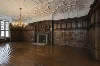 In seventeenth-century England, the ground floor of country houses had rooms designated for ordinary domestic purposes, while upper floors had more public uses.[22] Thus, the parlors in such houses, including the Rotherwas Room, would have been on the ground floor of the house and most likely near the kitchen.[23] In 1678, Thomas Blount described the Rotherwas Room as a "fair parlour full of coats-of-arms according to the fashion of the age" and "a [whole] dyning room wainscoted with walnut trees, and on the mantel tree of the chimney 25 coats in one achievement." Large Jacobean country houses in England had at least two parlors adjoining the hall. These were for the summer and the winter, and were commonly used as drawing rooms or private dining rooms.[24] Families at the time would use them to dine privately or informally entertain their guests.[25] Reference to the use of parlors at the time include examples from William Shakespeare's Taming of the Shrew, where Bianca and the widow 'sit conferring by the fire,' and in Sir Philip Sidney's Arcadia, where Kalander brings Palladius 'into the parlour where they used to sup.'[26]