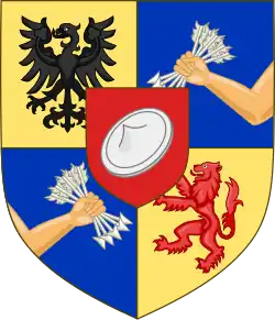 ![]() ![]() Quarterly: 1st, Or an eagle displayed Sable langued Gules; 2nd, Azure issuing from the sinister flank an arm embowed proper grasping five arrows points downward Argent; 3rd, Azure issuing from the dexter flank an arm embowed proper grasping five arrows points downward Argent; 4th, Or a Lion rampant Gules; over all an escutcheon Gules charged with an oval target with pointed center Argent per bend sinister | |