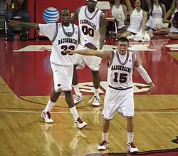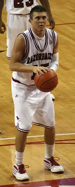 Coming out of high school, Clarke was highly recruited, attracting more than 50 scholarship offers.[3] There was so much interest in Clarke, that he ran up a $400 cell phone bill largely on texts from interested coaches.[3] His bedroom was filled with more than 2,500 recruiting letters.[4] ESPN ranked Clarke as the sixth best point guard, and 52nd best player overall in his recruiting class.[12] Dave Telep, analyst for Scout.com, wrote "He is flat out, without a doubt, the best shooter in the 2008 class".[7] The service rated Clarke as 4-stars.[13] Clarke turned down offers from Gonzaga, Kansas, Kentucky, Memphis, North Carolina, Oklahoma, and Oklahoma State, among others, in order to sign with Arkansas in November 2008.[2][3][11] He liked the school's fans, staff, and facilities, and the fact that he would be able to contribute from day one.[2] Clarke's immediate family relocated to Fayetteville, where his maternal grandmother also lived, to support his career.[2] "My grandma really [worked] on me" to choose Arkansas, he remarked.[7]
