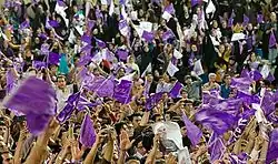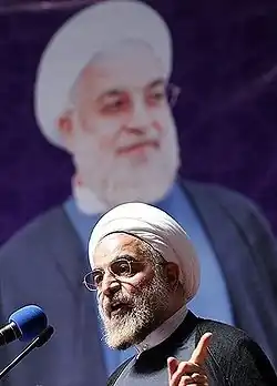 Hassan Rouhani, a moderate Iranian politician and former Secretary of the Supreme National Security Council, also known as the Diplomat Sheikh, launched his presidential campaign in March 2013.[1] He was earlier expected to withdraw and endorse Ali Akbar Hashemi Rafsanjani after he registered, but he returned to the race after Hashemi's disqualification. The symbol of Rouhani's campaign was a key and his slogan was "Government of Prudence and Hope." On 15 June, he was elected as the president with 18,613,329 votes.