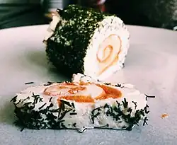 A roulade (/ruːˈlɑːd/[1]) is a dish of filled rolled meat or pastry. Roulade can be savory or sweet. Swiss roll is an example of a sweet roulade. Traditionally found in various European cuisines, the term roulade originates from the French word rouler, meaning "to roll".[2]