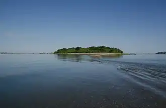 Bumpkin Island, also known as Round Island, Bomkin Island, Bumkin Island, or Ward's Island, is an island in the Hingham Bay area of the Boston Harbor. Bumpkin Island is part of Boston Harbor Islands National and State Park. The island has an area of 30 acres (12 ha), plus an intertidal zone of a further 31 acres (13 ha). It is composed of a central drumlin with an elevation of 70 feet (21 m) above sea level, surrounded by a rock-strewn shoreline. A sand spit, exposed at low tide, connects the eastern end of the island to Sunset Point in Hull.[1]