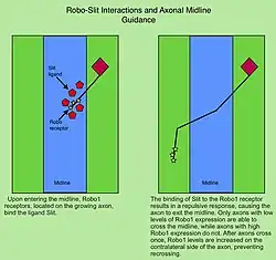 - ^ Kidd T, Bland KS, Goodman CS (March 1999). "Slit is the midline repellent for the robo receptor in Drosophila". Cell. 96 (6): 785–94. doi:10.1016/S0092-8674(00)80589-9. PMID 10102267. S2CID 15284604.