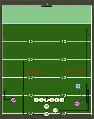 A wheel route can be run by a receiver or running back in American football. If a receiver runs it, they will immediately run a quick out pattern, then proceed to turn upfield in a curved pattern.[16] Typically this route is run by an inside receiver, with the number one receiver heading inside to exploit coverage in the defense. When run from the running back position the player will run towards the sideline while looking back at the quarterback as if about to receive a pass on a flare route. The running back will then turn upfield at the sideline and run straight down the field.