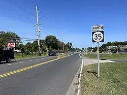 Route 35 crosses into Brielle, Monmouth County, immediately passing over the main channel of the Manasquan River on a drawbridge. Upon crossing into Brielle, the route heads further west from the railroad tracks and intersects Ashley Avenue and the southern terminus of Route 71. The route continues northwest and crosses into Wall Township and meets the intersection of Route 34 and Route 70 at the former Brielle Circle, now an at-grade intersection with jughandles. Past this intersection, Route 35 heads north on a two-lane, undivided road that passes by many businesses. It meets the intersection of Atlantic Avenue (CR 524 Spur) at the Manasquan Circle, where the Circle Factory Outlet Center is located. Past the Manasquan Circle, Route 35 heads north as a three-lane road with a center left-turn lane that intersects with Allaire Road (CR 524).[1][2] Route 35 widens to a four-lane divided highway and intersects the eastern terminus of Route 138, which continues west to become I-195. Route 35 curves to the east and crosses into Belmar where it becomes River Road. Here, the route runs along the south bank of the Shark River as a four-lane undivided highway, intersecting with H Street, where Route 71 heads to the south and running concurrently with that route. The two routes continue north along a divided highway until the intersection with 8th Avenue, where Route 71 heads to the east. Past this intersection, Route 35 becomes a four-lane, undivided road again, with the North Jersey Coast Line east of the road, and crosses the Shark River into Neptune Township.[1]