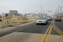 Route 35 begins at the entrance to Island Beach State Park in Berkeley Township, Ocean County, at the southern tip of the Barnegat Peninsula. South of Seaside Park, Route 35 is Central Avenue as it is the only road while it travels along the shore of the Peninsula. It heads north, varying between a two-lane road to a four-lane divided highway with parking spaces in the median and bike lanes on the outside through residential areas of South Seaside Park.[2] It briefly becomes an undivided highway before crossing into Seaside Park, where the route becomes four-lane, divided Central Avenue, which also has median parking spaces. Route 35 passes by residences in Seaside Park, with the median widening for the Seaside Park Police Department building at the intersection of 6th Avenue, and then the road widening to six lanes further north.[1][2] Upon crossing the intersection of Decatur Avenue, the southbound lanes of Route 35 run one block to the west of the northbound lanes and then turns to the west, bypassing Seaside Heights, a beach resort that has a boardwalk and an amusement pier. There, Route 35 turns north and has an interchange with the eastern terminus of Route 37 on the Seaside Heights/Berkeley Township border on the eastern shore of the Barnegat Bay. At this interchange, a ramp provides access from northbound Route 35 a short distance past the ramp from eastbound Route 37 to Seaside Heights, connecting to Sumner Avenue.[1][3]