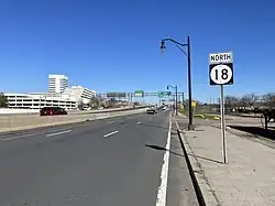 Route 18 is a 47.92-mile-long (77.12 km) state highway in the central part of the US state of New Jersey. It begins at an intersection with Route 138 in Wall Township, Monmouth County, and ends at Interstate 287 (I-287) in Piscataway, Middlesex County. Route 18 is a major route through Central New Jersey that connects the Jersey Shore to the Raritan Valley region, connecting the seats of Monmouth County (Freehold) and Middlesex County (New Brunswick) respectively. The route runs through Ocean Township, Marlboro, East Brunswick, and is the main thoroughfare for Rutgers University. Much of the route is a freeway (including the entire portion in Monmouth County and much of the northern end through New Brunswick and Piscataway). The remainder of the route is an arterial road with traffic lights in the East Brunswick and Old Bridge areas, and a boulevard in the remainder of Piscataway. Route 18 was designated in 1939 as a proposed freeway from Old Bridge to Eatontown.[2] The section west of Old Bridge was formerly designated as part Route S28, a prefixed spur of State Highway Route 28 from Middlesex to Matawan. The designation, assigned in the 1927 renumbering, remained until a second renumbering in 1953. At that point, Route S28 was redesignated as Route 18, though the section from Old Bridge to Matawan was signed as TEMP 18, as this section would be decommissioned when the Route 18 freeway was built.