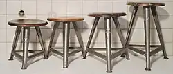 The design of the Rowac stool represents the functionalist ideal advocated by the Bauhaus, among others, in Germany in the interwar period, in which practicality and utility were intended to be at the centre of aesthetic interest. From 1926 on, the stools found their way into the classrooms and workshops of what was probably the most influential art school of the new, modern style, the Bauhaus Dessau.[25] The fact that Walter Gropius chose the Rowac stool, of all things, for the Bauhaus building is believed to be due to its technically refined yet simple construction.[11] Rowac advertised its stool in a Bauhaus brochure as follows: "the tried and tested rowac stools are in use in all rooms of the bauhaus!"[29] Photos from the Bauhaus archive show that Rowac stools were not only used as seating in the workshops, but also for all kinds of other activities in the Prellerhaus and by the in-house band (Die Bauhauskapelle).[30][31][32][33][34]