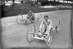 The use of a rowing-like action to propel a land vehicle goes probably to the 1870s, as George W. Lee used a sliding-seat in a tricycle.[1] Roadsculler races were held in Madison Square Garden in the 1880s.[2] A toy catalog from FAO Schwarz in 1911 advertised a four-wheeled "Row-Cycle" for children, operated using two levers in a standing position and with steering done by the feet.[3] In the 1920s, Manfred Curry in Germany designed and constructed the Landskiff ("land boat"), a four-wheeled vehicle that would be known as a Rowmobile in the English speaking countries.[1] A newsreel from 1937 shows a rowed bicycle that is very similar to today's Craftsbury SS rowing bicycle, Rowbike and VogaBike.[4]