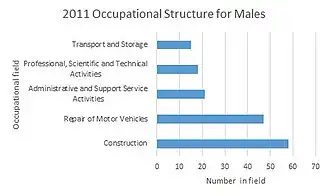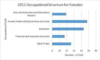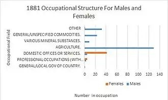 Information from occupational structure graphs shows a clear change in type of employment since the late 19th century. In 1881 agriculture was the dominant occupation whereas in 2011 many more residents worked in professional occupations. There is a clear change in the occupational structure for men who have shifted from Agricultural occupations to occupations involved in Construction. Nowadays, few women work in the Domestic Offices or Services, whilst the majority of women work in Social Services such as in Human Health or Education. This changing pattern of occupation fits in with the overall national trends, where 12% of those in England and Wales work in Skilled Trades Occupations.[7]