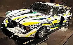 In 1969, Lichtenstein was commissioned by Gunter Sachs to create Composition and Leda and the Swan, for the collector's Pop Art bedroom suite at the Palace Hotel in St. Moritz. In the late 1970s and during the 1980s, Lichtenstein received major commissions for works in public places: the sculptures Lamp (1978) in St. Mary's, Georgia; Mermaid (1979) in Miami Beach; the 26 feet tall Brushstrokes in Flight (1984, moved in 1998) at John Glenn Columbus International Airport; the five-storey high Mural with Blue Brushstroke (1984–85) at the Equitable Center, New York; and El Cap de Barcelona (1992) in Barcelona.[49] In 1994, Lichtenstein created the 53-foot-long, enamel-on-metal Times Square Mural in Times Square subway station.[66] In 1977, he was commissioned by BMW to paint a Group 5 Racing Version of the BMW 320i for the third installment in the BMW Art Car Project. The DreamWorks Records logo was his last completed project.[2] "I'm not in the business of doing anything like that (a corporate logo) and don't intend to do it again," allows Lichtenstein. "But I know Mo Ostin and David Geffen and it seemed interesting."[67]
