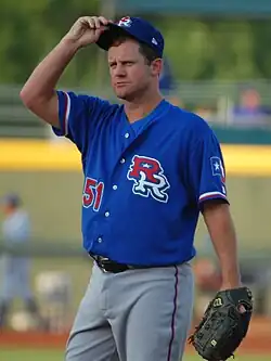 Oswalt was selected by the Astros in the 1996 MLB draft.[1] He made his MLB debut with Houston, in 2001, finishing his rookie season with a win–loss record of 14–3.[1] Oswalt was a back-to-back 20-game winner in 2004 and 2005. He helped lead the Astros to their first World Series appearance in 2005, and was named Most Valuable Player of the 2005 National League Championship Series (NLCS). When Oswalt left the Astros in 2010, both his wins (143) and strikeouts totals (1,593) ranked second in franchise history to Joe Niekro (144) and Nolan Ryan (1,866), respectively. Oswalt was a three-time All-Star, selected from 2005 to 2007.[2]