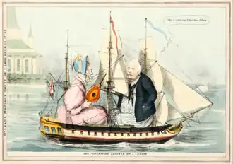 ![]() A satirical cartoon depicting King William IV and Queen Adelaide sailing in the Royal Adelaide, circa 1834. The actual yacht was 50 feet (15 m) long. | |