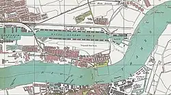 The dock, which was designed by Sir Alexander Rendel as an extension to the Victoria Dock, was constructed by Lucas and Aird and completed in 1880.[1] Two dry docks and machine shops were established to the south at the western end for ship repairs by R & H Green & Silley Weir (later River Thames Shiprepairs Ltd).[2]