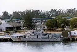 The Royal Brunei Navy (RBN), Tentera Laut Diraja Brunei (TLDB), رايل بروناي نافي, is the naval defence force of Brunei Darussalam. It is a small, but relatively well-equipped maritime force, whose main responsibility is to conduct search and rescue (SAR) missions, and to deter and defend the Bruneian sovereign waters against attack mounted by sea-borne forces.[12] Headquartered at Muara Naval Base,[2] as of 2023, the Royal Brunei Navy has an operational inventory of twenty ships or similar surface vessels; the RBN does not operate any submarines or submersibles.